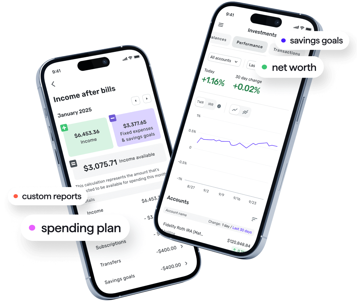 Spending, income, savings, and net worth, along with extensive customization